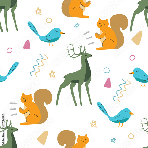 Seamless vector pattern featuring a diverse collection of animals including wild, farm, exotic species. Modern style perfect for children’s products, wallpapers, textiles, packaging, educational