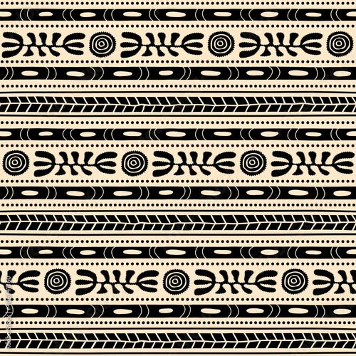 Seamless vector pattern including ethnic Australian motive with dotted different elements on white background