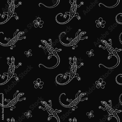 Seamless vector pattern of lizards and flowers. Background for greeting card, website, printing on fabric, gift wrap, postcard and wallpapers.