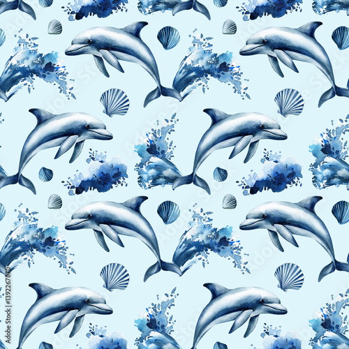 Seamless watercolor pattern. Dolphins seashells ocean waves blue colors for tropical sea life underwater animal design