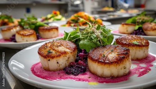 Seared scallops, a vibrant pink sauce, and fresh greens on white plates. A professional kitchen setting is in the blurred background