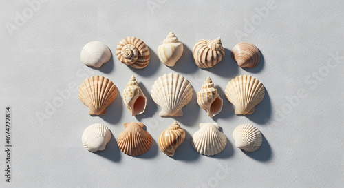 shell, seashell, sea, beach, ocean, marin, coastal, summer, vacation, sand, background, blue, light, nature, natural, texture, pattern, collection, still life, decor, decoration, design, isolated, mollusc, spiral, beige, ivory, white, clean, simple, minimal, arrangement, sorted, grouped, topview, overhead, tabletop, studio, nobody, calm, zen