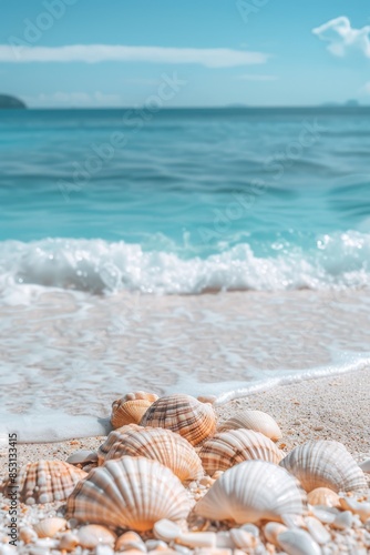 beach, summer, vacation, tropical, paradise, sand, sea, ocean, shell, shore, coastline, relaxation, sunny, blue water, seashell, copy space, banner, hi-res, photorealistic, high-quality, travel, holiday, get-away, coastal, scenic, idylli, serene, leisure, beachfront, sunny day