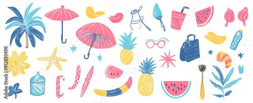summer, abstract, element, vacation, symbol, watermelon, sun umbrella, seashell, pineapple, vector, illustration, white background, hand-drawn, cartoon, doodle, creative, artwork, trendy, poster