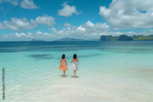 children, beach, ocean, sea, tropical, serene, girl, dress, fairy, childhood, innocence, friendship, sister, play, vacation, summer, sand, shoreline, turquoise, blue, water, horizon, calm, leisure, travel, holiday, sunny, bright, scenic, coast, seascape, relaxation, harmony, adorable, cute, calmness, together, bonding, playful, carefree