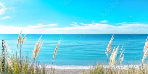 Seaside view under a bright blue sky, showcasing the beauty of the seaside and the vibrant hues of a clear blue sky, perfect for illustrating coastal landscapes and tranquility.