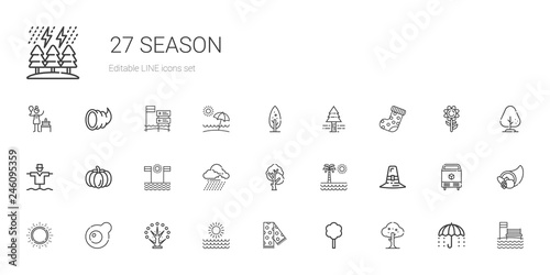 season, icon, set, vector, tree, foulard, sun, egg, pilgrim, beach, storm, pumpkin, scarecrow, sock, pine, umbrella, cornucopia, ice, sunflower, birch, illustration, symbol, isolated, signs, design, nature, element, background, line, graphic, black, silhouette, summer, white, concept, web, spring, leaf, landscape, collection, shape