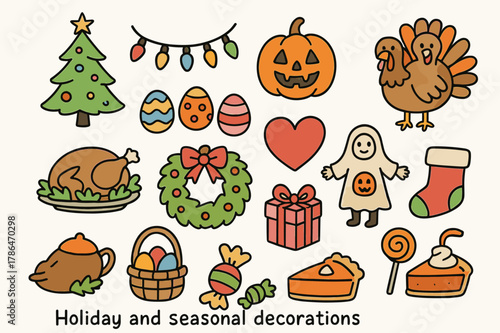 Seasonal Festive Icons. Holiday and seasonal decorations. Hand-drawn doodle illustration Holiday and seasonal decorations, Christmas tree, colored Christmas