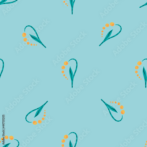 Seasonal seamless pattern with minimalistic yellow lily of the valley ornament. Pastel blue background.