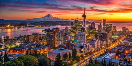 Seattle Aerial View: Vibrant Sunset Long Exposure Photography