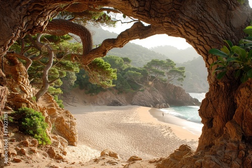 Secluded Beach View Through Twisted Tree Trunk in Coastal Landscape