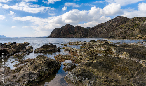 murcia, spain, europa, nature, landscape, coastline, mountainous, mountain, semi-desert, nature reserve, arid, shrub, vegetation, ocean, water, beach, outdoors, nobody, sky, cumulus, scenic, scenery, park, algae, colours, colourful, rock, rocky, shore, wave