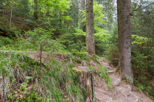 mountain, forest, tree, trunk, stump, spruce, fir, coniferous, evergreen, deciduous, bush, grass, slope, hill, hillside, mountain chain, nature, season, springtime, overcast, tour tourism, travel, environment, outdoors, landscape, scenic