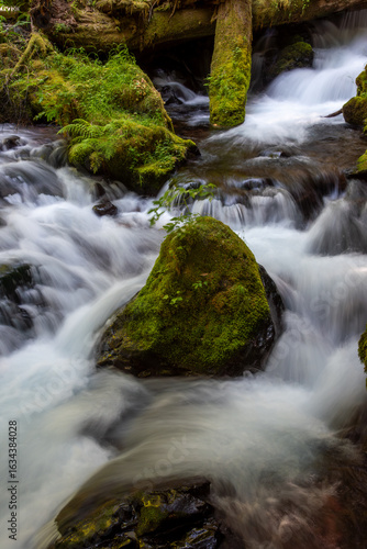 Section of the upper stream feeding into Panther Creek falls in Washington with an obstruction in the flow path