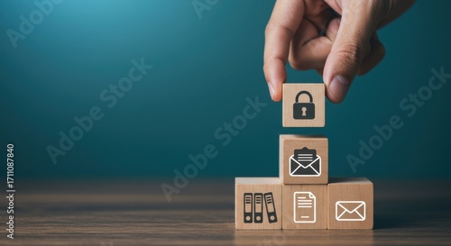 Securing digital information with data protection and privacy icons on wooden blocks stacked in a pyramid