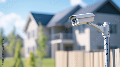 Security Camera on Fence: A security camera mounted on a pole, overlooking a residential area, providing a sense of security and peace of mind for homeowners.
