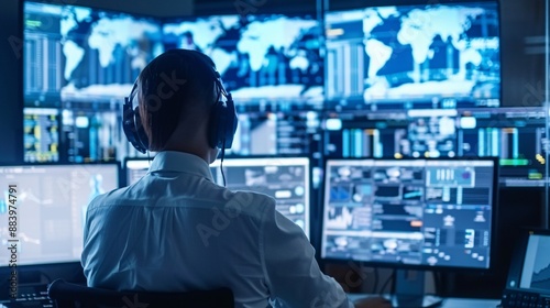 Security Operations Center Specialist Monitoring Multiple Screens with High-Tech Surveillance Systems, Analyzing Data Feeds, Ensuring Network Safety in a Cybersecurity Command Center Environment.