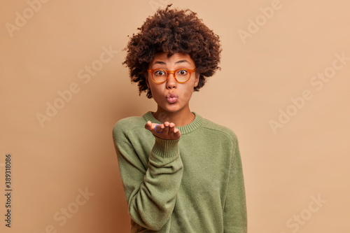 Seductive pretty girl with Afro hair sends mwah at camera makes air kiss gesture flirts with you keeps lips folded expresses admiration looks tenderly dressed casually poses indoor. Body language