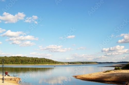 see, reservoir, heaven, blue, cloud, water, shore, beach, fisherman, fish, recover, man, waiting, sitting, reflex, im, yellow, sand, polen, recreation, memory