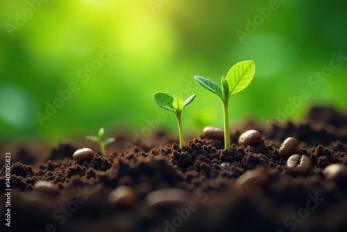 Seedlings emerging from coffee bean pods in lush greenery, plants , seedling