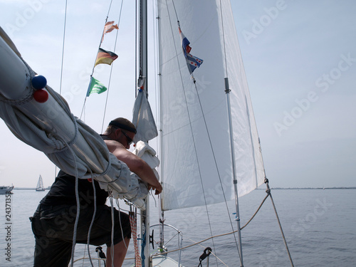 man, context, sail, sail, sea, horizon, captain, labor, summer, sun, sailboat, view, heaven, cloud, background, pylon, rigging, man