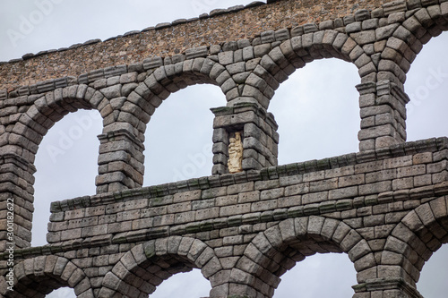 Segovia aqueduct on a cloudy, detail of the sculpture of the Virgin of Fuencisla