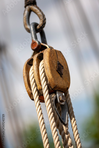 Seilzugrollen an einem alten Schiff