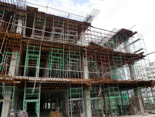 SELANGOR, MALAYSIA -JULY 4, 2021: Scaffolding is installed as temporary support for concrete formwork at the construction site. Installed according to the design approved by the engineer.