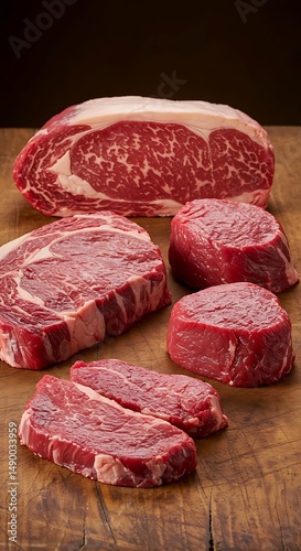 Selection of raw beef cuts showcasing marbling and fresh texture on wood surface