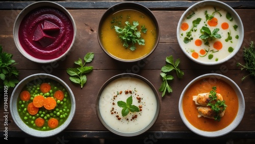 Selection of soups from around the world, healthy cuisine. Creamy mushroom soup, fish chowder, meat soup, chicken soup presented on rustic wood background. Top-down view.