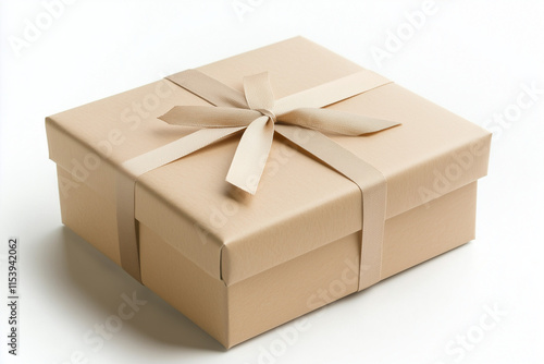 Selective focus minimal gift box in celebration festival isolated on white background, Beige carton present box with rope and ribbon on white background.