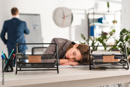 selective focus of document trays with lettering near woman sleeping at desk near, procrastination concept