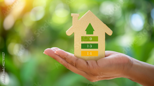 Selective focus on a hand holding a house icon with an energy efficiency scale, symbolizing the commitment to energy conservation and sustainable housing solutions