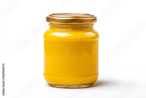 Selective focus yellow mustard in the glass jar isolated on white background.