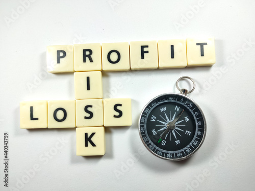 Selective focus.Scrabble letters with text PROFIT,RISK,LOSS with compass on white background.