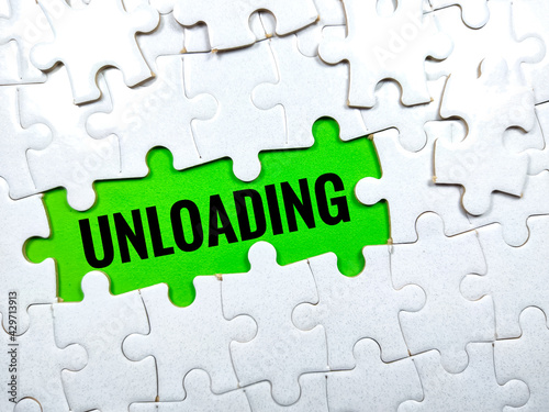 Selective focus.Word UNLOADING with jigsaw puzzle on green background.