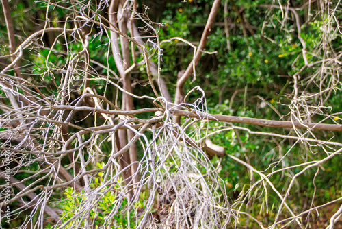 selective shot bare tree branches against green background in the woods