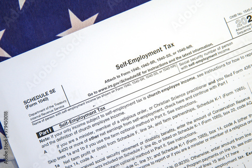 Self Employment Tax form on the American flag backdrop. 1040 for self-employment tax background