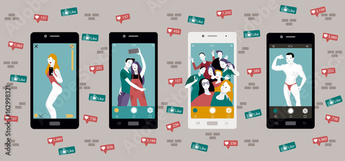 social, phone, network, community, lifestyle, digital, screen, communication, follow, follower, illustration, app, connection, people, technology, selfie, mobile phone, couple, character, connect, application, group, photo, camera, mobile, self, friends, like, banner, blog, buttons, comment, notification, facebook, nubes, trend, self-portrait, happy, narcissism, addiction, post