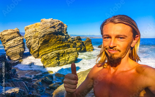 Selfie with rocks cliffs view waves beach Puerto Escondido Mexico.