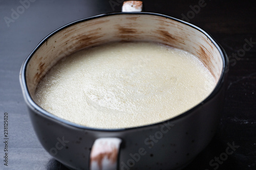 Semolina porridge in a vintage Breakfast bowl on a dark wooden table.