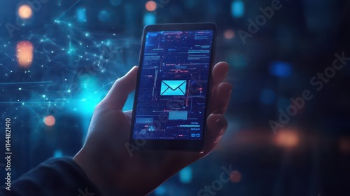 send email or receive e-mail concept, smartphone in hands, future design, big data technology, intelligence internet and modern technology