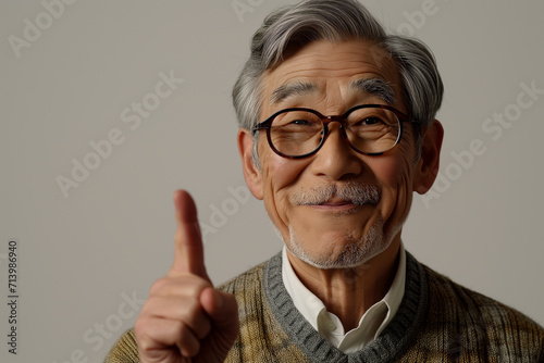 Senior adult Japanese man against white wall. Pointing senior man. Wagging finger, serious mature man. Senior man asking to focus with his forefinger. Senior man having good idea