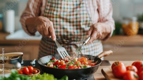 Senior Adult Using Adaptive Cooking Utensils to Prepare a Nutritious Dish with Fresh Vegetables in Their Home Kitchen