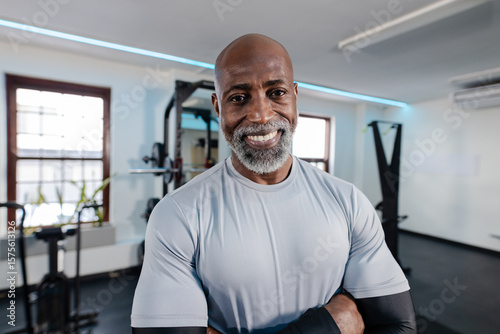 people, barbell, african american, senior, man, athletic, health, strength, wellness, motivation, gym, standing, arms crossed, exercise bike, natural light, bright, modern, casual attire, mature, endurance, male, training, physical exercise, lifestyle, equipment, muscle, power, focused, active, health care, well-being, physical fitness, professional, gym wear, background, copy space