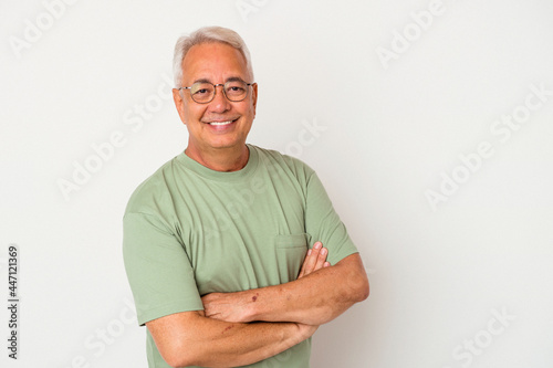 Senior american man isolated on white background who feels confident, crossing arms with determination.