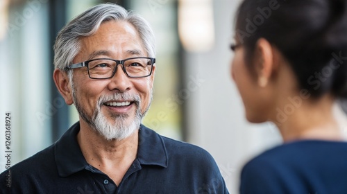 Senior Asian professional in casual conversation. Represents business mentorship, professional wisdom, and corporate leadership.