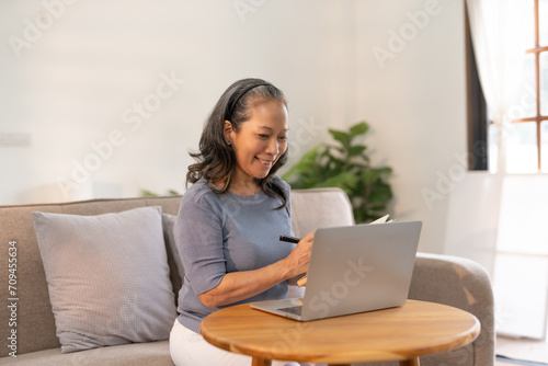 Senior asian woman sitting on sofa using laptop computer, working, chatting, social media internet at home.