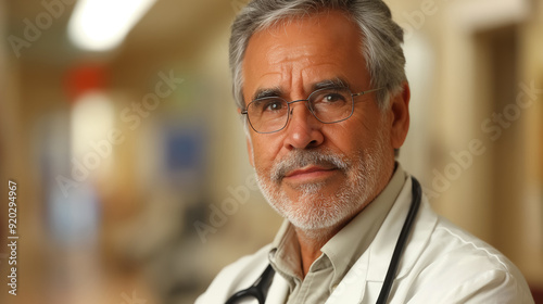Senior doctor with glasses and a stethoscope, exuding experience and compassion in a hospital corridor, representing dedication to healthcare and patient care.