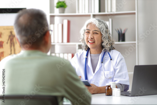 Senior health care concept. Doctor with patient in medical office. Retired man sits in a hospital examination room while discussing his health with a doctor.